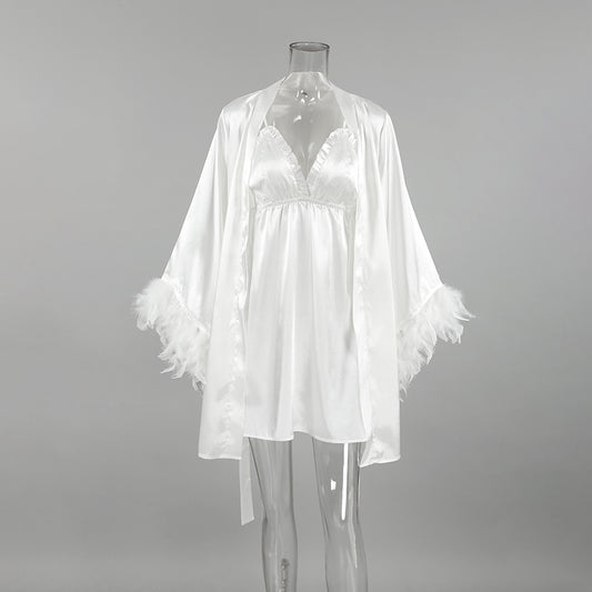 Loose Night Dress Robe Two Piece Sets Satin Stitching Feather Sleeve Solid Color Ladies Homewear