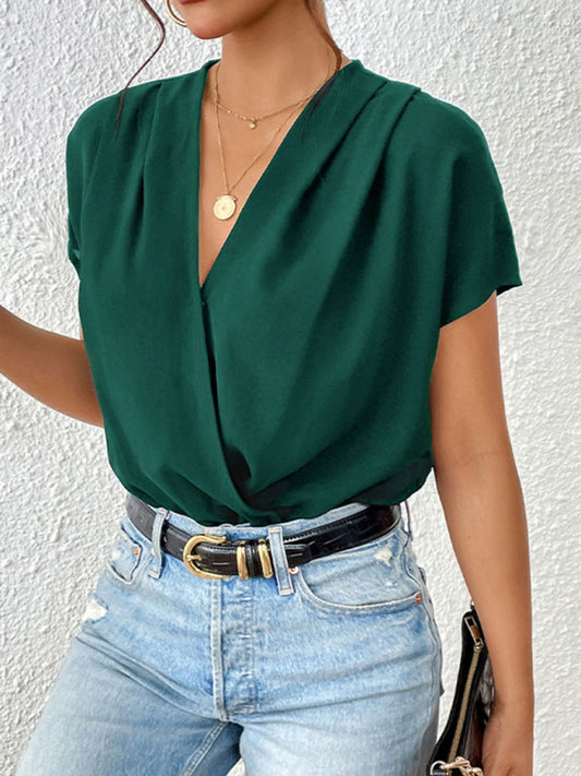 Women's V-neck pleated dropped shoulder elegant bodysuit