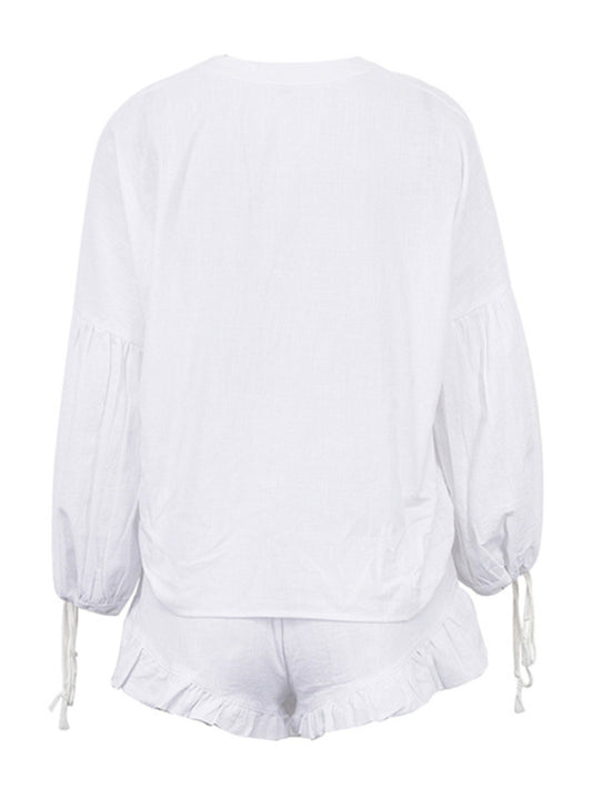 Women's V -neck casual loose short sleeve bag shorts two -piece suit two -piece suit