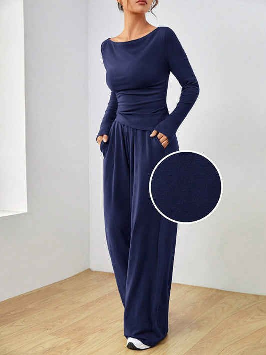 Women's solid color long-sleeved casual wide-leg trousers fashionable two-piece set