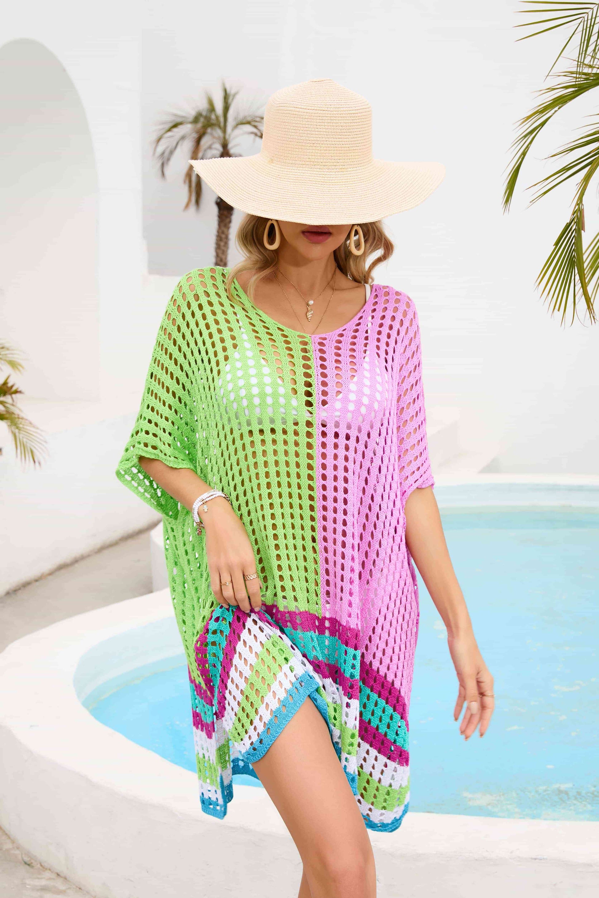 Contrast Scoop Neck Openwork Half Sleeve Cover Up