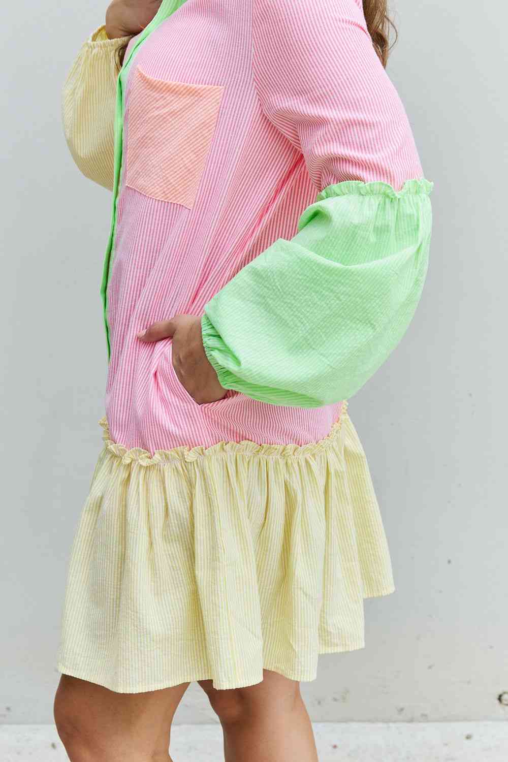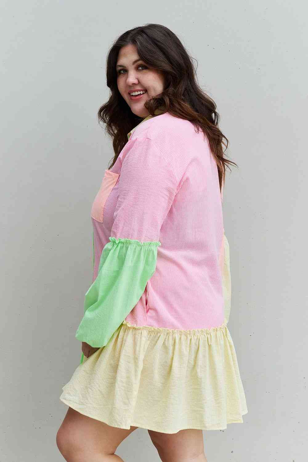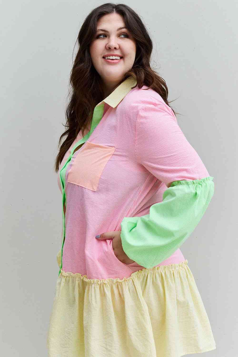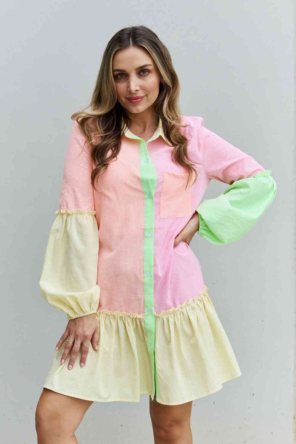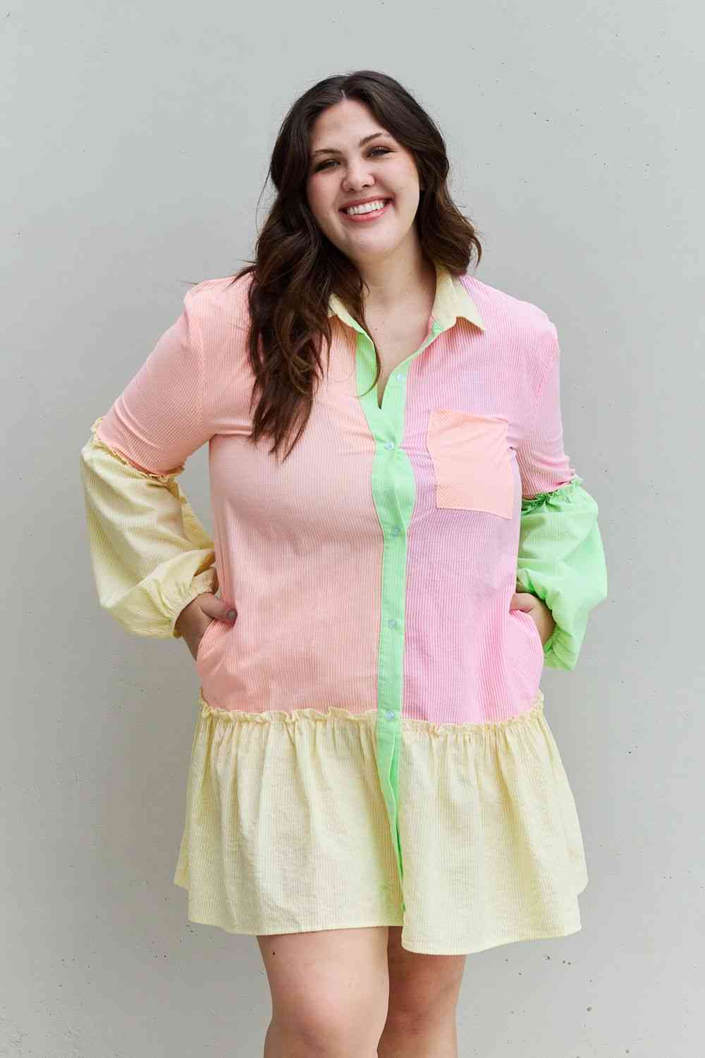 Davi & Dani Flying Colors Full Size Colorblock Long Sleeve Shirt Dress