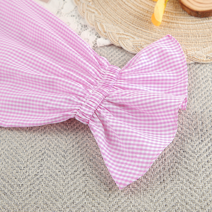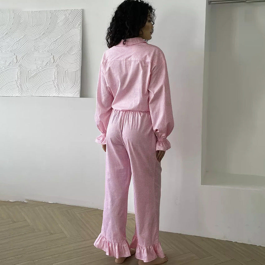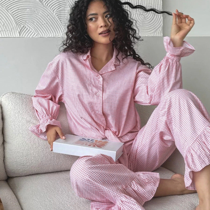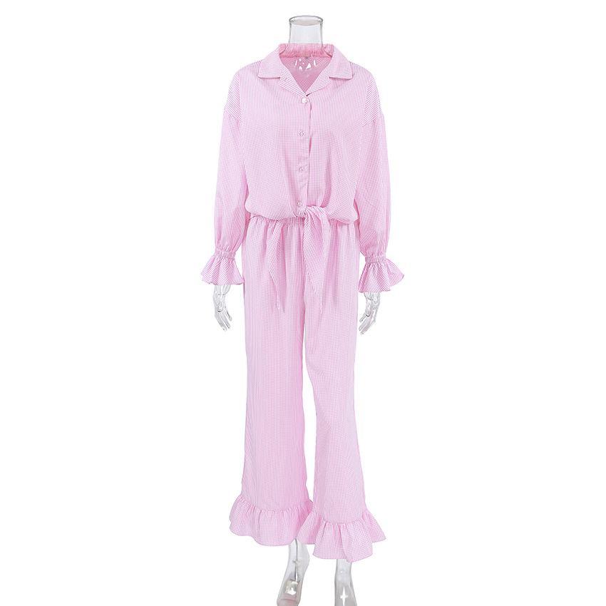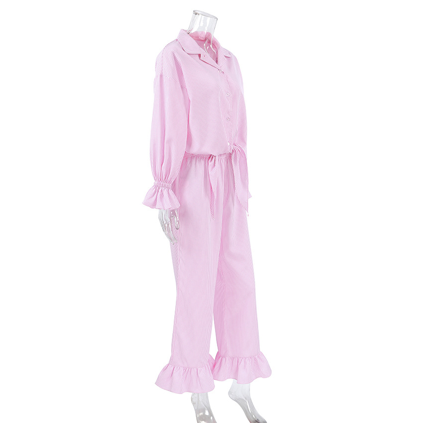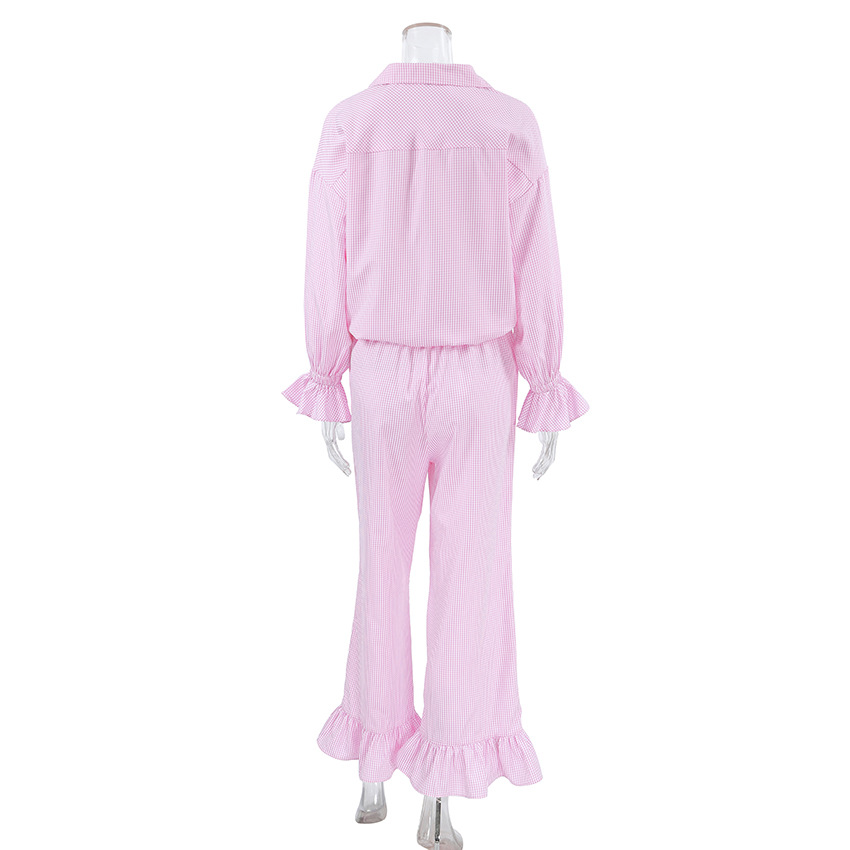 Fall Pink Plaid Retro Pajamas Ruffled Long Sleeved Cardigan Trousers Two Piece Home Wear Women