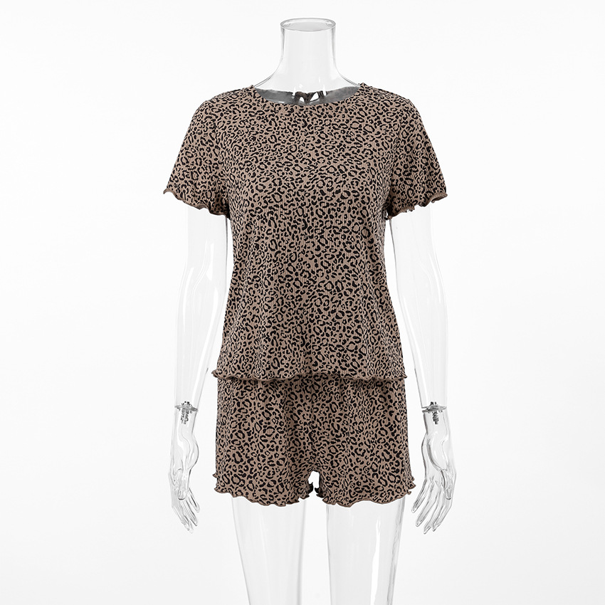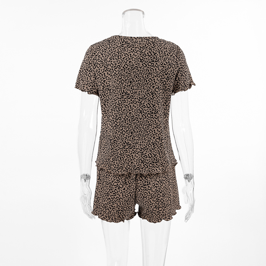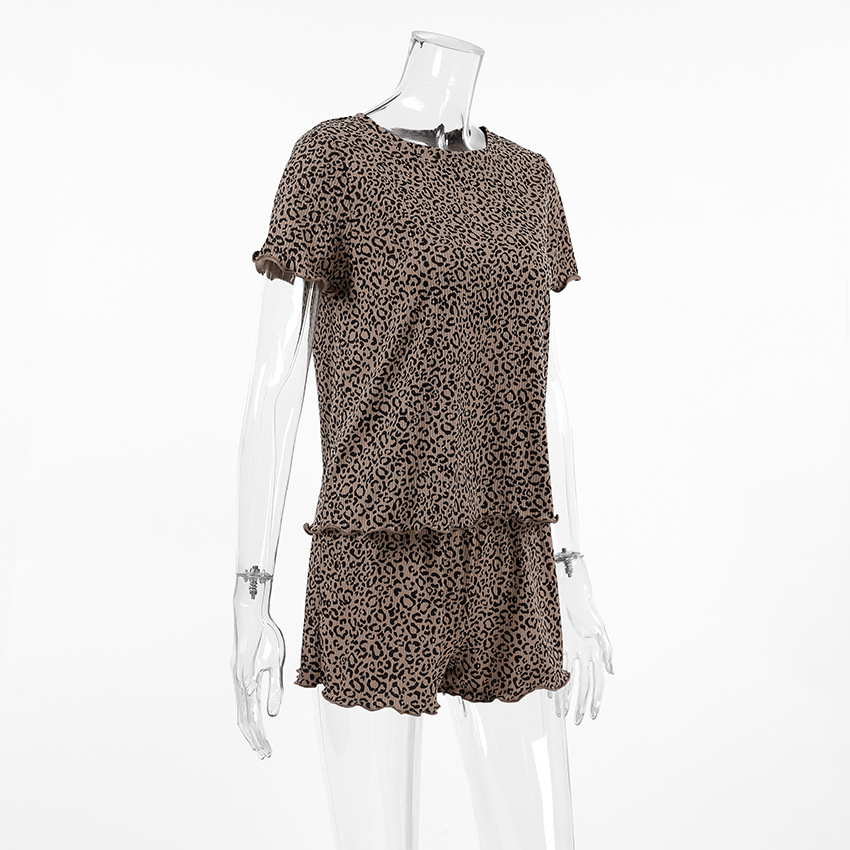 Ladies Leopard Print Short Sleeved Shorts Two Piece Sets Pajamas Summer Casual Simple round Neck Homewear